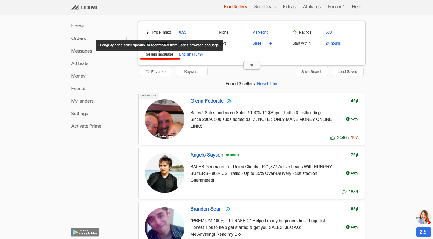 También puedes filtrar a los vendedores de Udimi por el idioma que hablan. El programa de Udimi detecta automáticamente su idioma. Esto te ayuda a reducir la cantidad de vendedores aptos para tu audiencia.