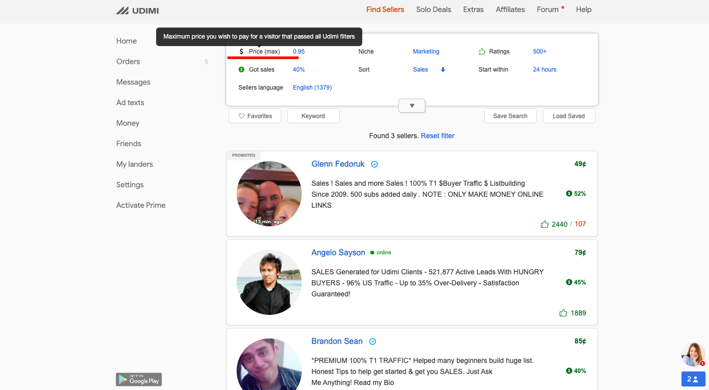 Al buscar un buen vendedor de Solo Ads en Udimi debes tener en cuenta el valor de cada clic que ofrecen los vendedores. Usando esta información, puedes saber cuántos clics obtendrás por el monto que invertirás.