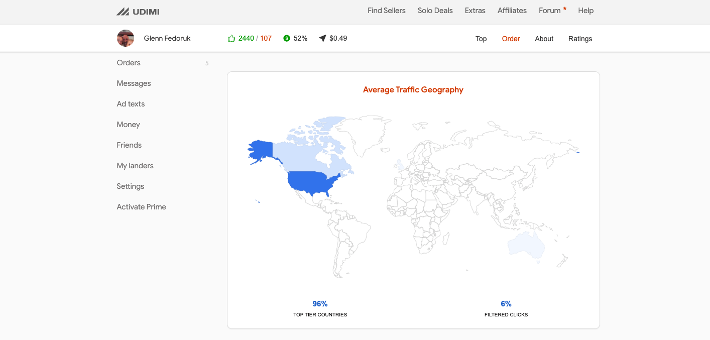 Al comprar Solo Ads, es necesario tener en cuenta de dónde proviene el tráfico web que se está comprando. Esta imagen muestra un ejemplo de un vendedor en Udimi y de qué regiones del mundo es su audiencia.